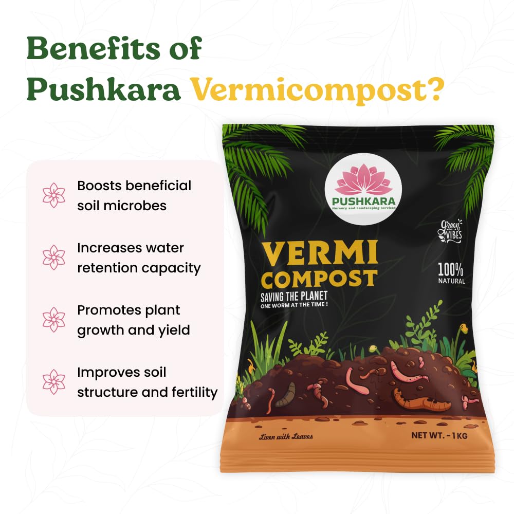 Pushkara Vermicompost is suitable for indoor plants, outdoor plants, vegetables, fruits, flowers, lawns, and ornamental plants.